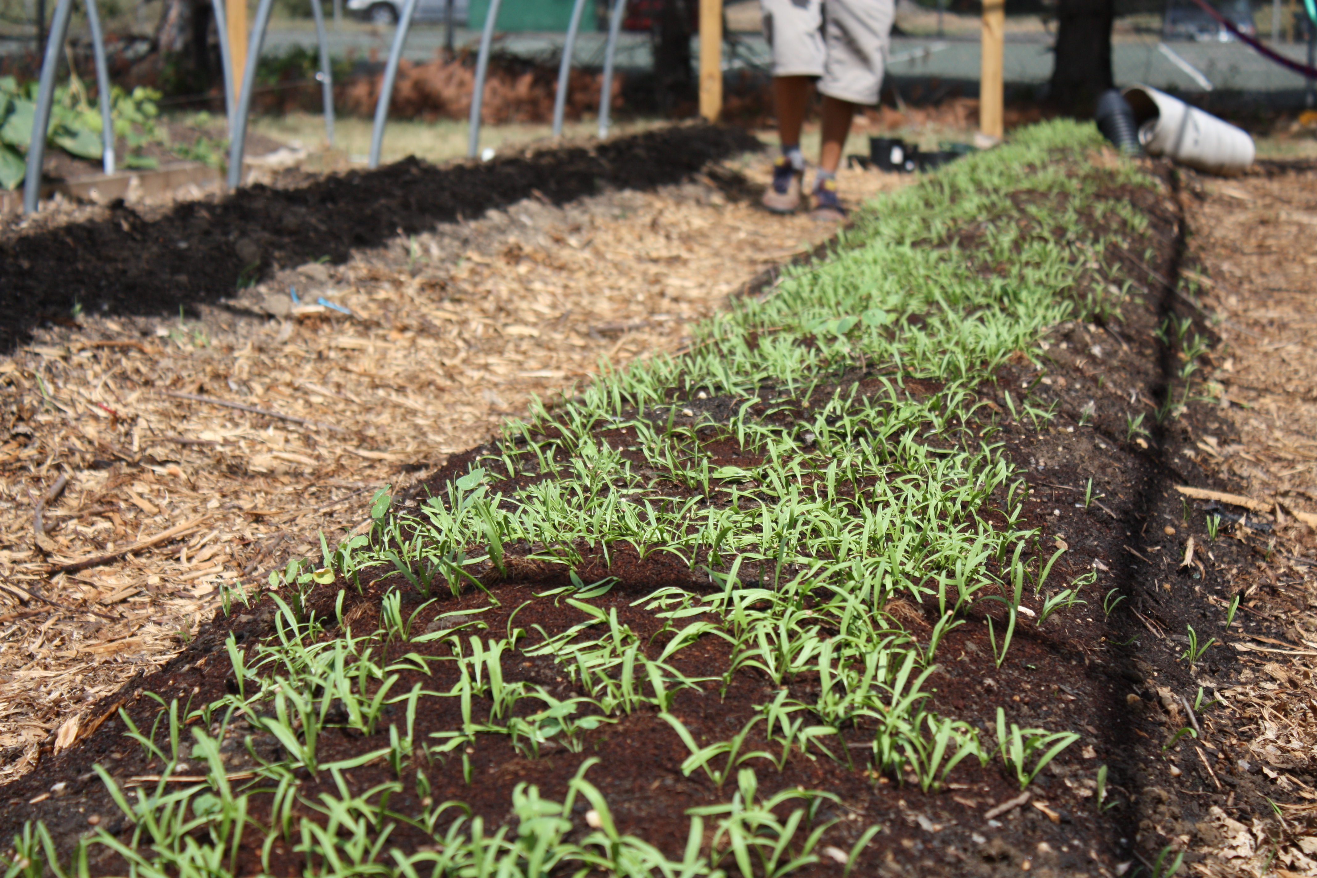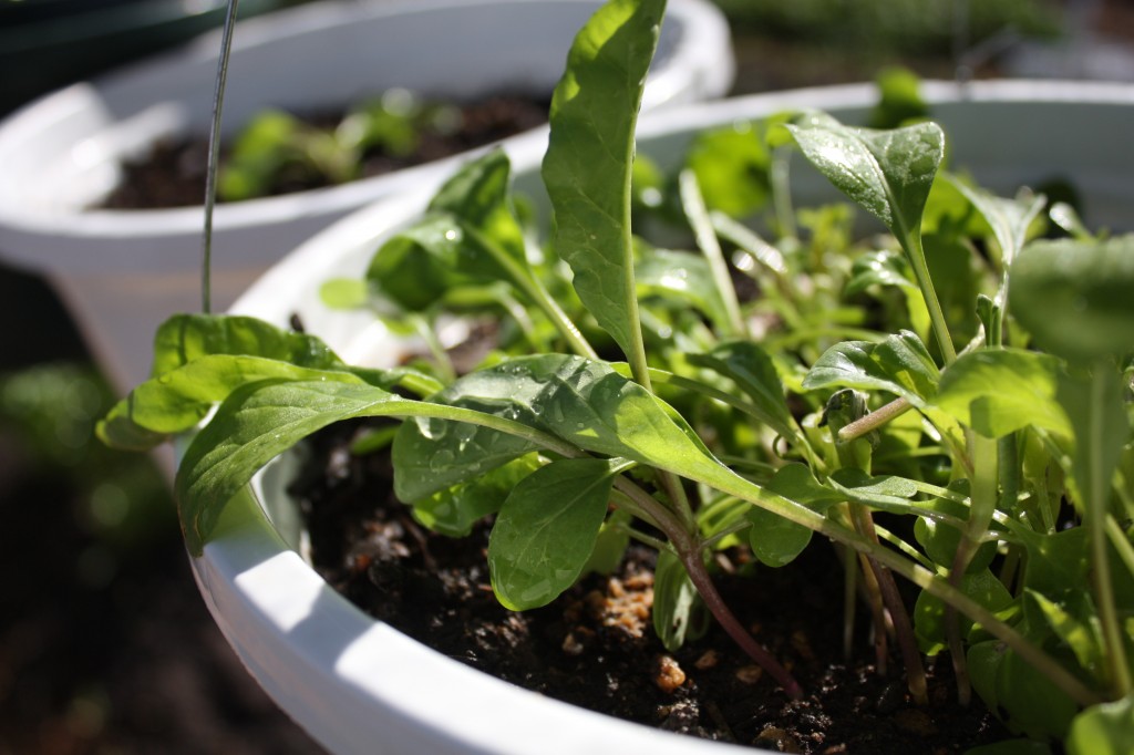 We’ve been growing arugula in beds as well as in hanging pots, in order to most efficiently utilize space.