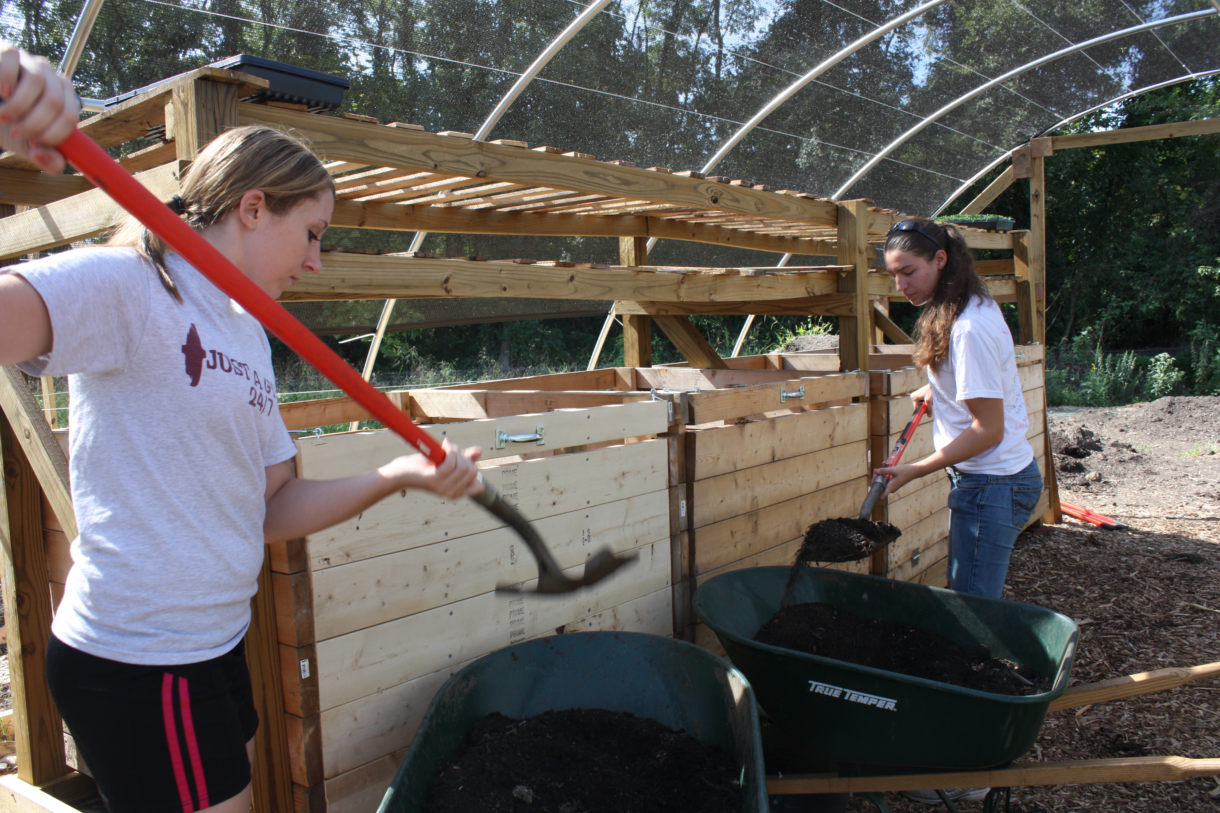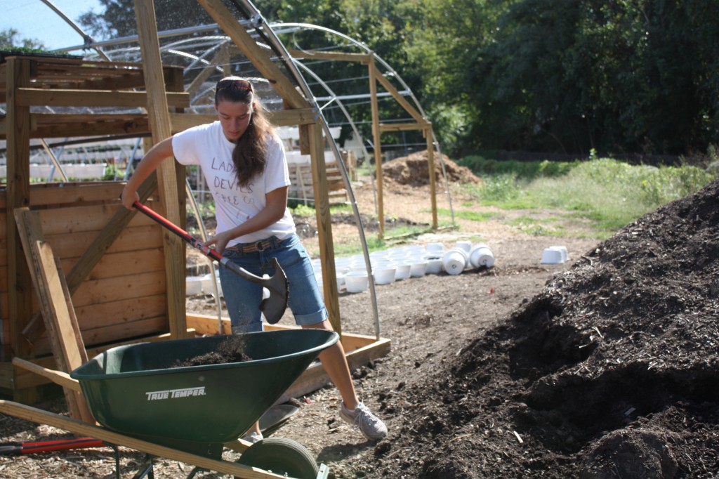 The volunteers filled the installed compost bins with compost, in preparation for a delivery of worms. Christian Melendez, the volunteer coordinator, is in Milwaukee for the Growing Power conference and will be returning on Monday with a truck filled to the brim with worms that we will be moving to their new homes – into these bins and also onto the beds. At the moment we have 5 bins, eventually there will be 16. From these bins we will then be collecting the vermiculture (a fancy way of saying worm poop – the most nutritious soil you can get, even better than plain compost), which will provide our plants with the most bioavailable nutrients.